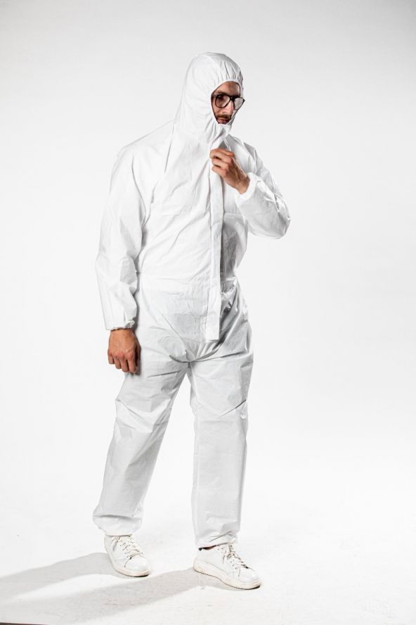 Mosható higiéniai overál cseppzáró anyagból fehér színben, bújtatott cipzárral
